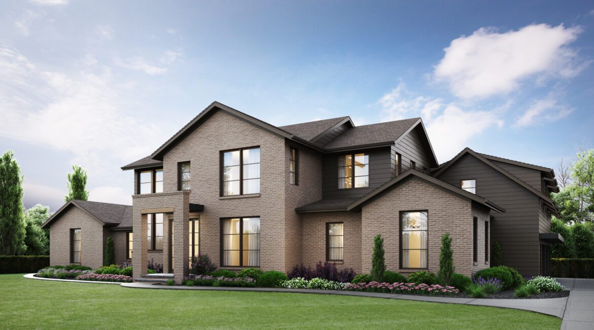 - Contemporary residence with sleek exterior consisting of black brick and lap siding