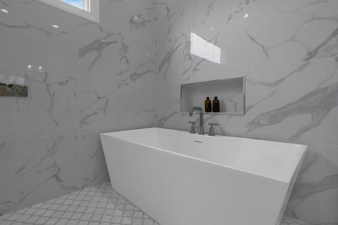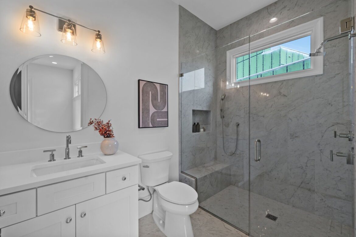 - Luxurious first-floor owner’s retreat with a vaulted ceiling, spa-inspired bath featuring a zero-entry shower, free-standing tub, and spacious dressing room