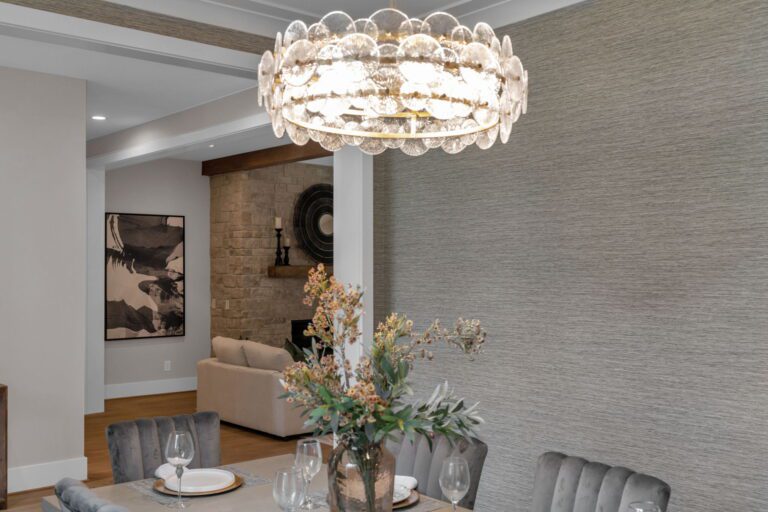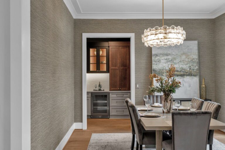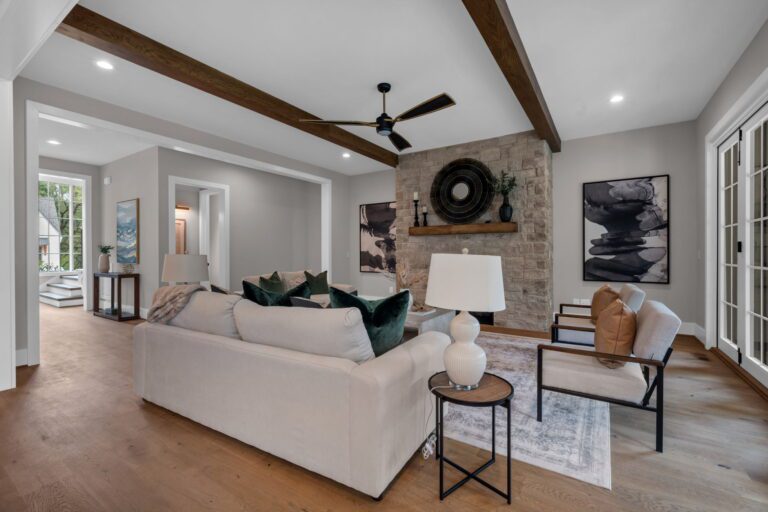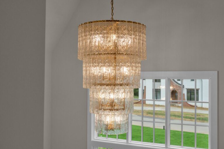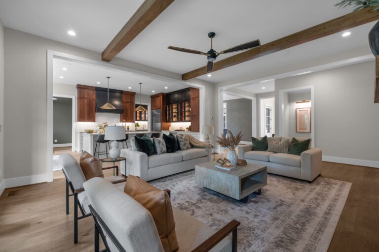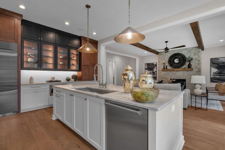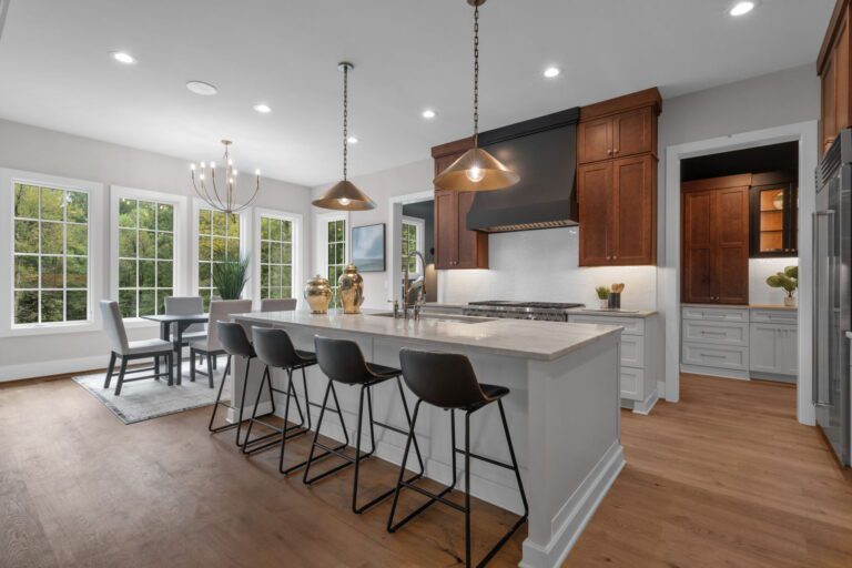 - Chef’s kitchen with a large island and designer appliances, opening to the great room and breakfast area