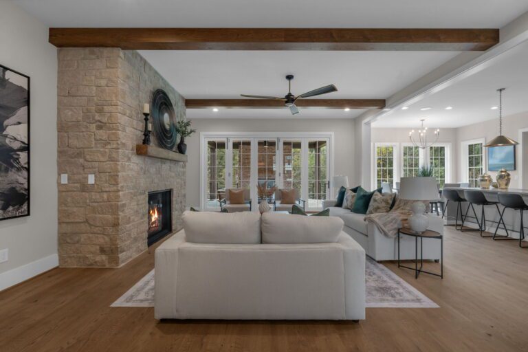 - Rear screened porch with a fireplace, extending from the great room through glass accordion doors for indoor/outdoor living