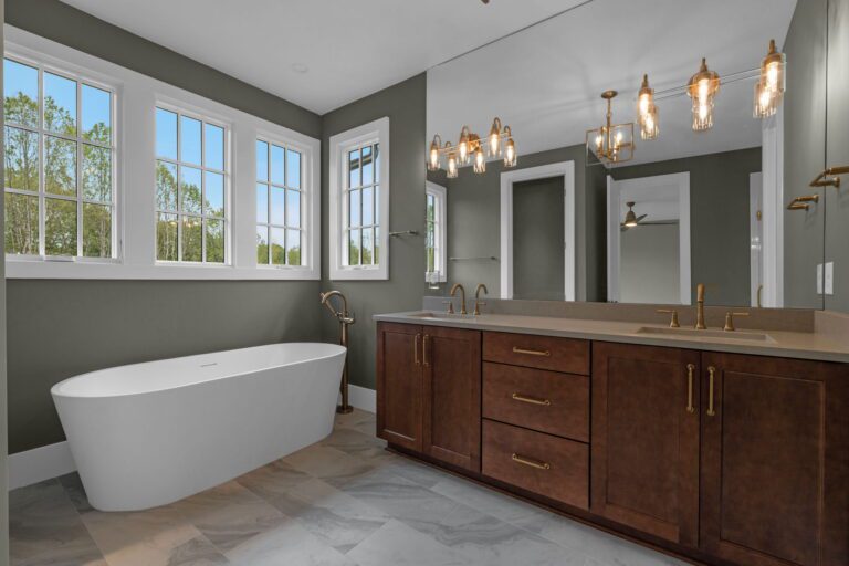 - First-floor owner’s suite with luxury bath featuring a free-standing soaking tub, large shower, and oversized walk-in closet with stackable laundry
