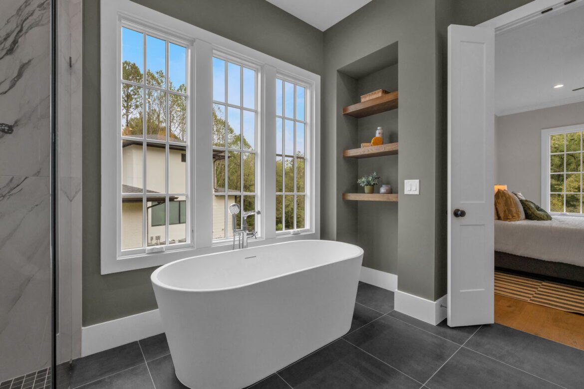 - First-floor owner’s suite with luxury bath featuring a free-standing soaking tub, large shower, and oversized walk-in closet with stackable laundry